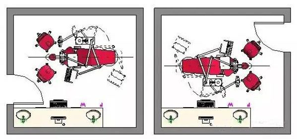 關(guān)于牙椅設(shè)備的擺放原則一是 病人進(jìn)入診室,坐上牙椅的路程最短為佳,二是盡量避免患者腳端直接對(duì)著門的方向,病人隱私差,不安情緒強(qiáng)。如下圖: